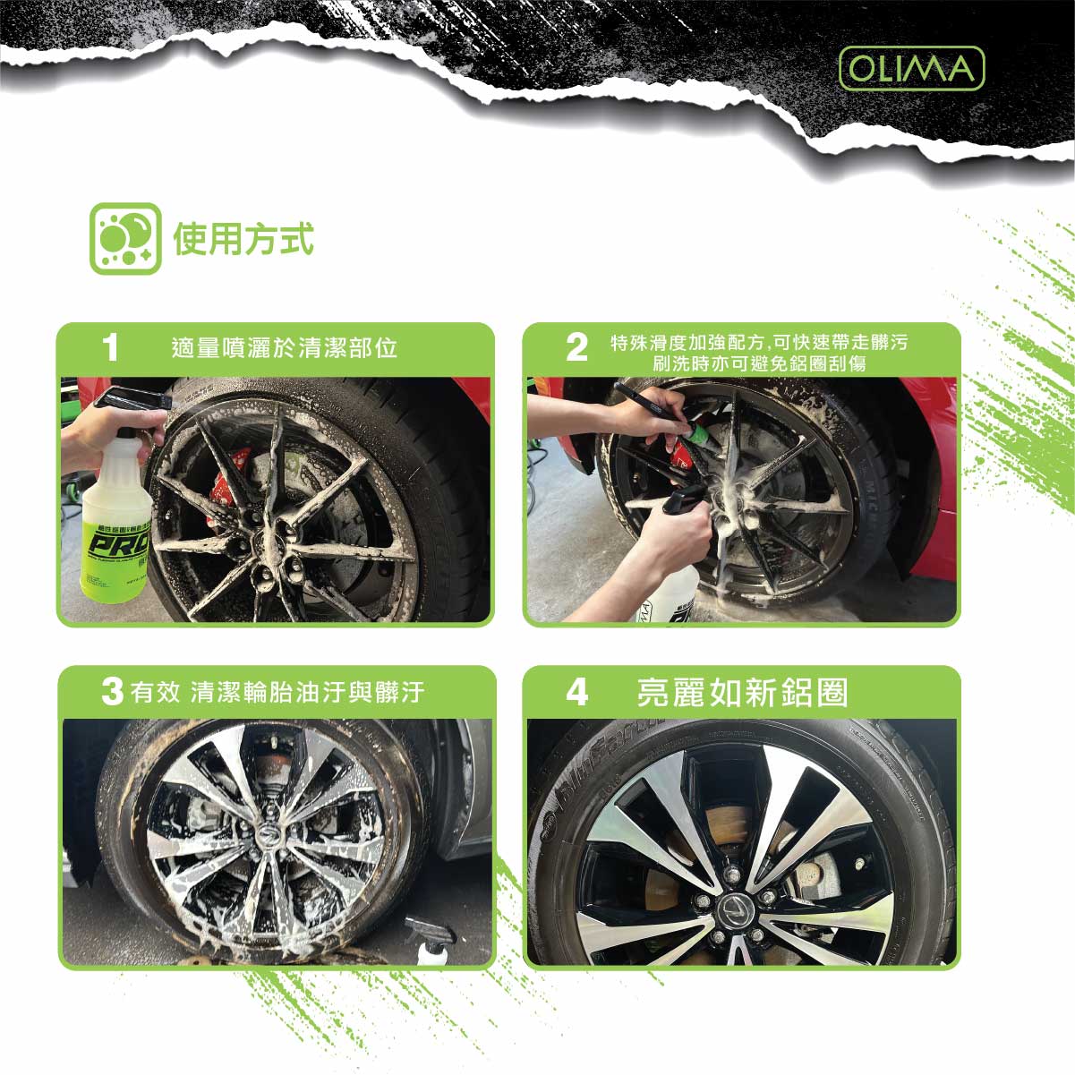 使用流程:噴灑適量於鋁圈上,靜置1~2分鐘後用高壓沖洗,如髒汙較嚴重可噴後搭配OLIMA鋁圈刷或是細節刷加強加快清潔效果