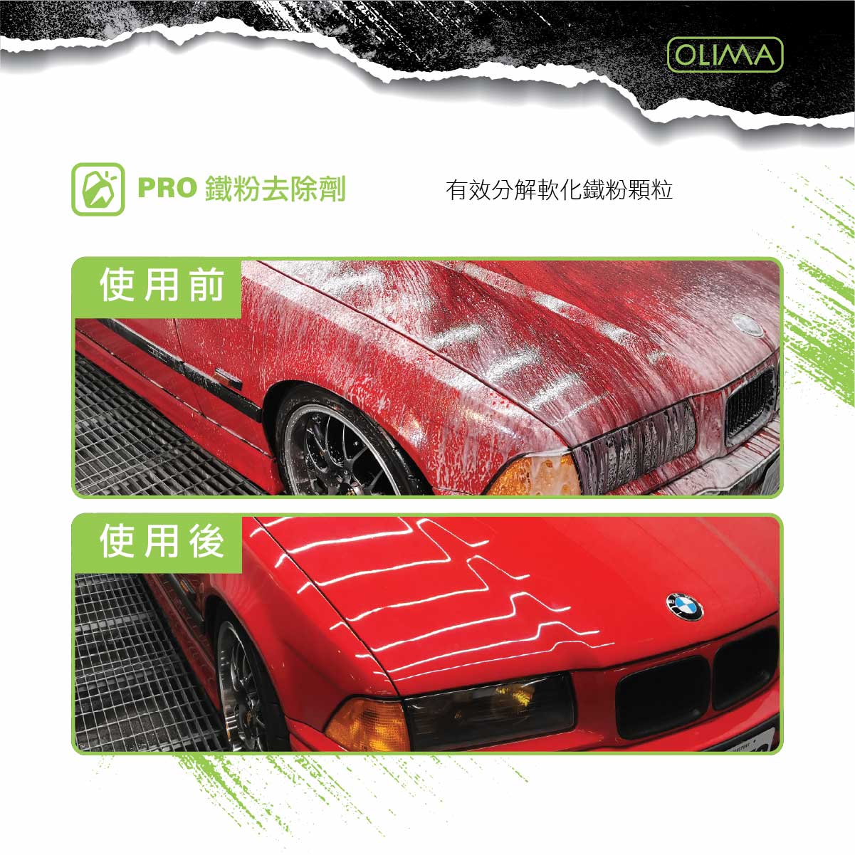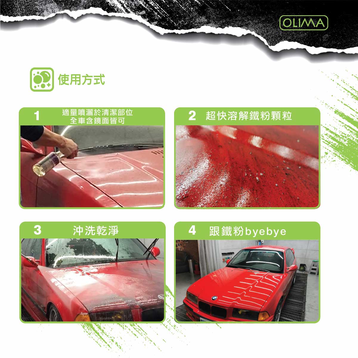 注意事項:噴灑後勿放置太久到鐵粉劑乾掉(分解出來的紫色鐵粉如果完全乾掉於漆面會留痕跡,這時請用OLIMA清潔蠟去除即可)